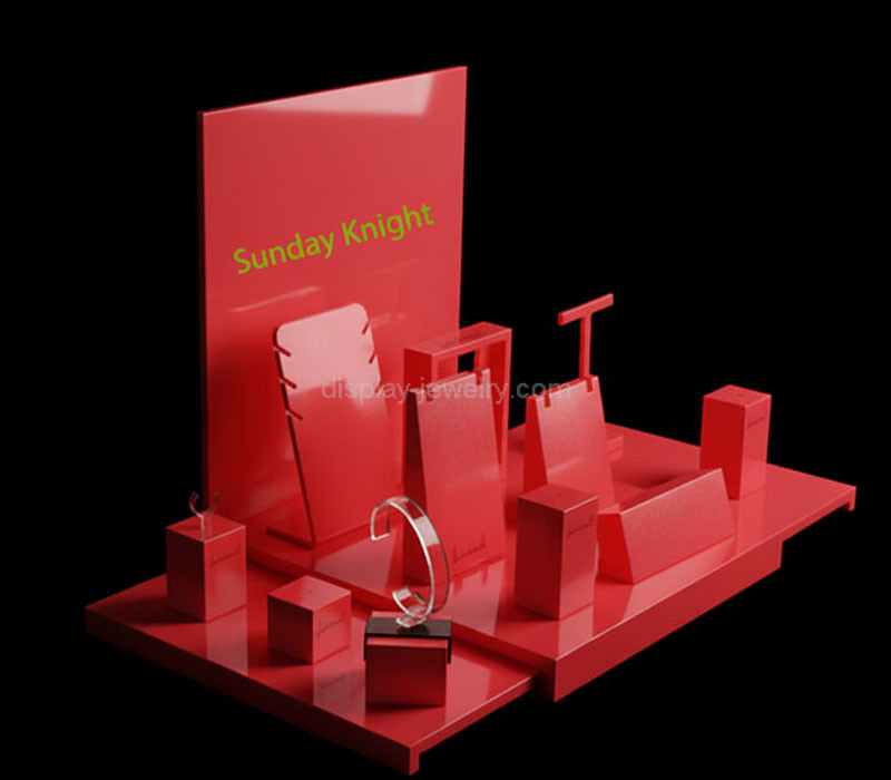 Custom red acrylic boutiques jewelry set display prop – a stylish solution for showcasing necklaces, earrings, and bracelets with elegance. Crafted from durable, high-quality acrylic, perfect for retail or exhibitions. No extra customs fees for shipments to the USA, Europe, UK, and Asia.
