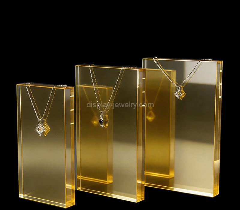 Custom translucent yellow acrylic necklace display blocks, designed for boutiques and retail stores. These vibrant, high-quality acrylic blocks elegantly showcase necklaces, adding a pop of color while keeping jewelry organized and easily accessible. Perfect for countertops or display cases, they combine visual appeal with practical, stylish functionality.