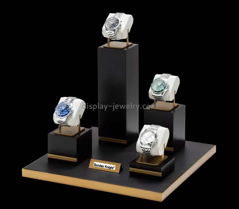 These custom gold and black acrylic countertop watch display risers offer a luxurious and sophisticated way to showcase timepieces. Crafted from high-quality acrylic, their dual-tone design combines the richness of gold with the elegance of black, creating a visually stunning backdrop for any watch collection.
