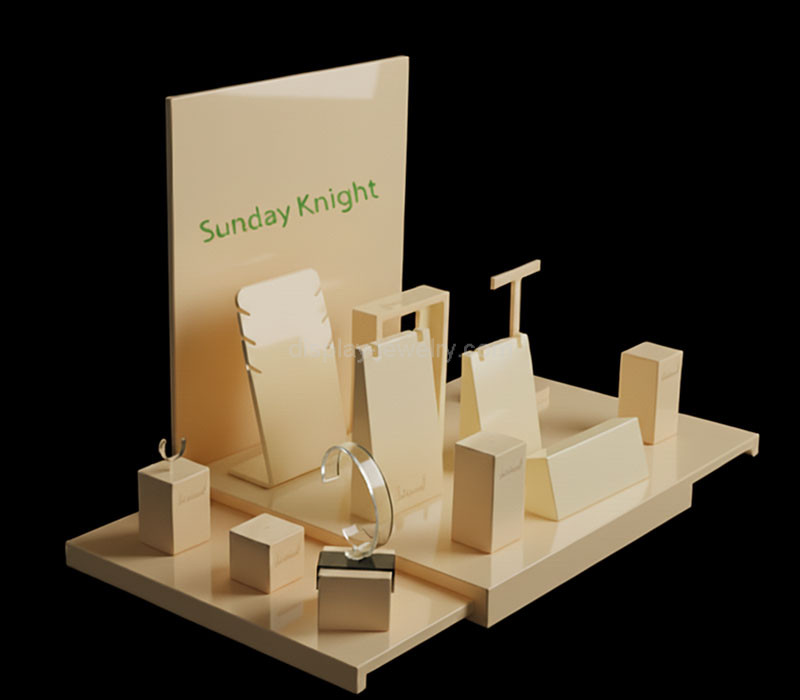Custom light yellow acrylic exhibitions jewelry set display stand – crafted to highlight necklaces, earrings, and bracelets with elegance. Durable, stylish, and perfect for exhibition use. Delivered door-to-door with all taxes and duties fully covered for a smooth experience.