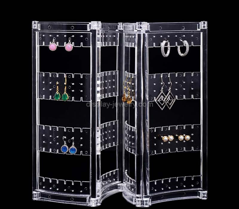 Custom acrylic foldable earring display stand offers convenient storage and space-saving portability for retail or personal use. Lightweight yet durable construction ensures stability. Available in clear or custom colors and shapes. Easy to assemble and transport. Perfect for wholesale orders and customized branding displays.