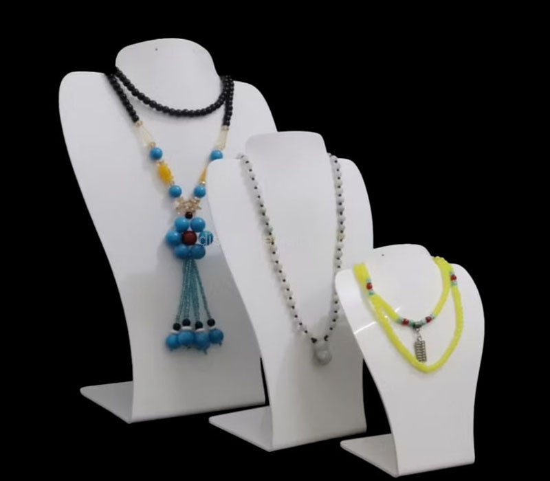 Custom white acrylic neckform necklace display props designed to highlight jewelry with elegance and clarity. Perfect for retail stores, exhibitions, or personal collections. Crafted with durability and modern style in mind. Enjoy worry-free doorstep delivery—shipping fees, duties, and taxes are fully included for your convenience.