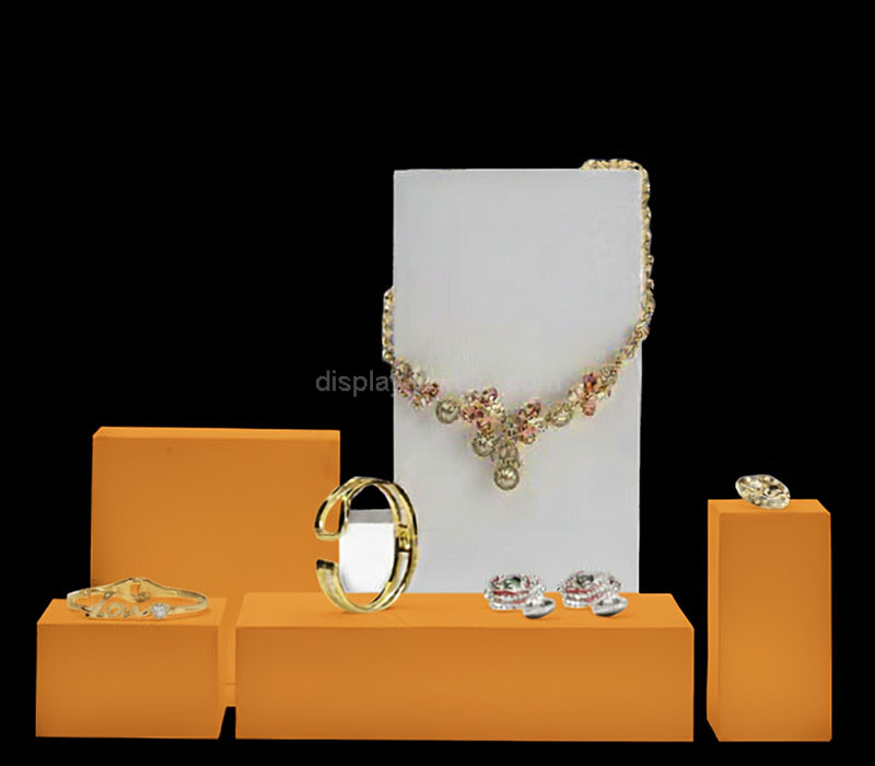 Custom yellow + white acrylic jewellery set display blocks for retail stores, designed to highlight accessories with a bright, modern aesthetic. Durable and easy to clean, perfect for showcasing rings, necklaces, and earrings in style. -Shipping Includes Everything – Taxes, Duties, and Smiles.