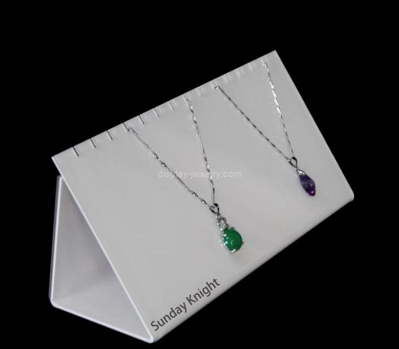 Elegant white acrylic triangle stands for necklaces, ideal for retail or personal use. Sturdy, clear display, enhances jewelry presentation.