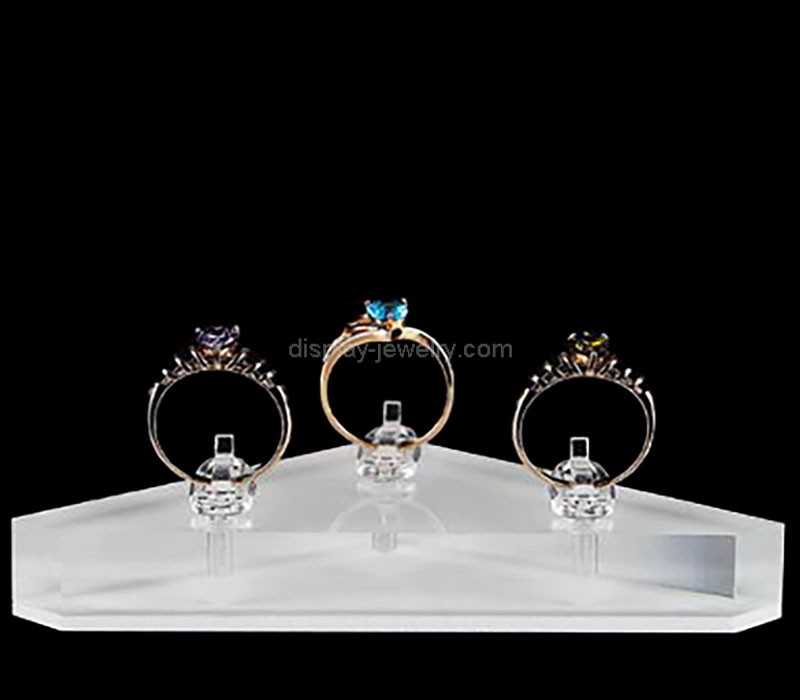Wholesale custom acrylic triangle ring display blocks, featuring a unique triangular design for showcasing rings in style. Crafted from durable acrylic, ideal for retail displays, trade shows, or exhibitions. Customizable for branding, offering a modern, eye-catching presentation.