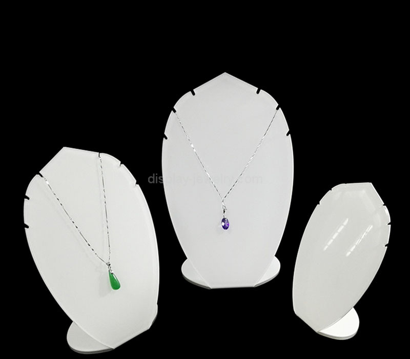 These wholesale custom white plexiglass jewelry necklace display racks offer a stylish and durable solution for showcasing necklaces. Made from high-quality white plexiglass, they ensure clear visibility and an elegant presentation, perfect for jewelry stores, boutiques, or trade show displays.
